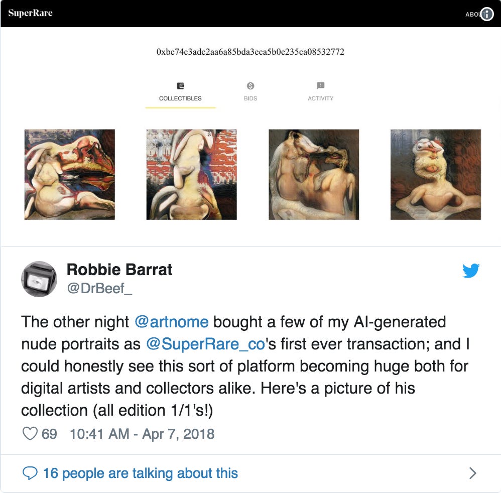 SuperRare published a post recently about “Auditable Social Metrics,” with the SuperRare team looking into how to measure the value of NFTs in different ways. Engagement data on the blockchain is also much more public and transparent than the status quo of opaque models like the big tech companies today. Currently, users can like and view different art on SuperRare, with this data eventually becoming much more robust and filterable (ex. View likes and views from Ethereum accounts with >5 transactions.)