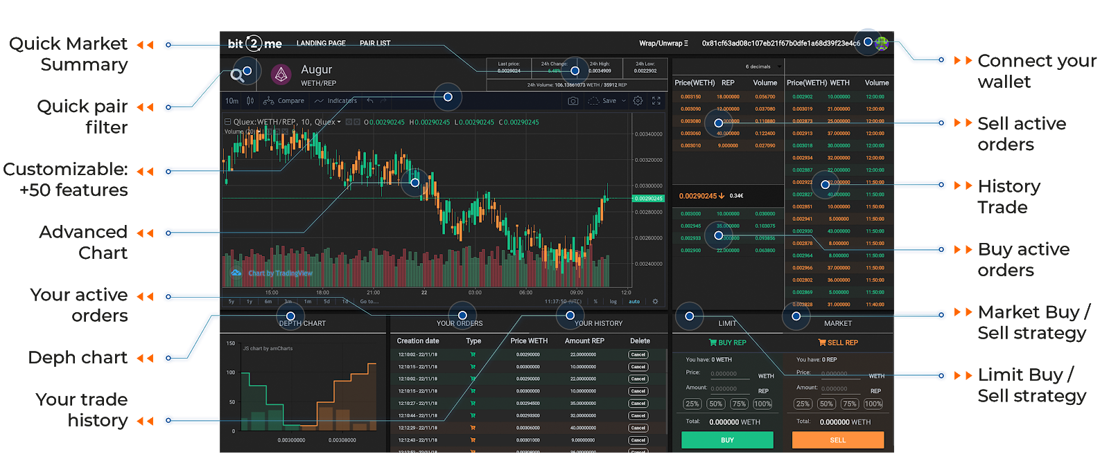 I’d like to introduce a new relayer, Bit2Me that is based in Madrid. Bit2Me got its start in 2014 by connecting Bitcoin with thousands of ATMs in Spain, letting anyone easily convert Bitcoin into cash. They’ll be fully launching soon, but here’s a sneak peek at their sleek interface: