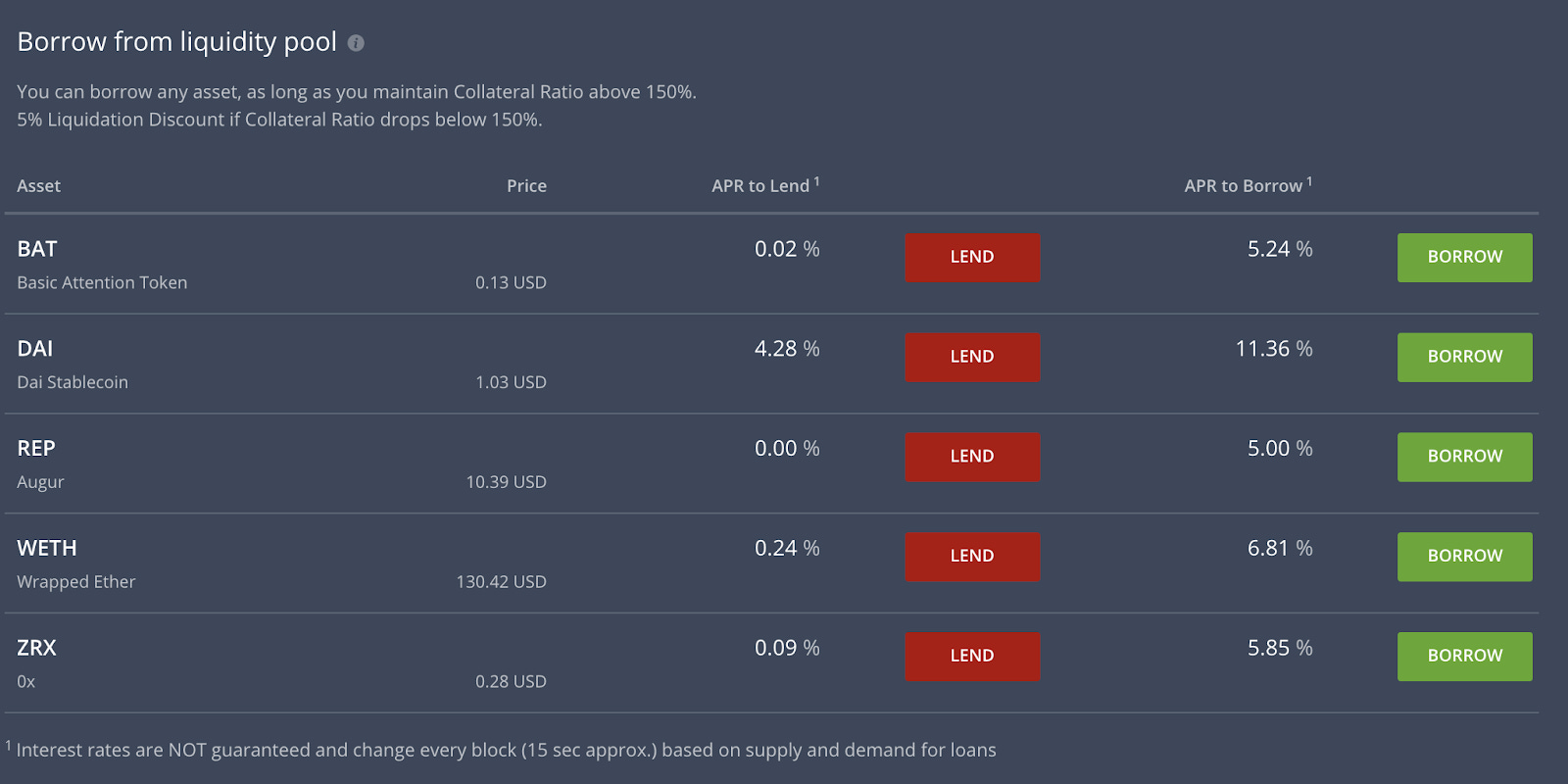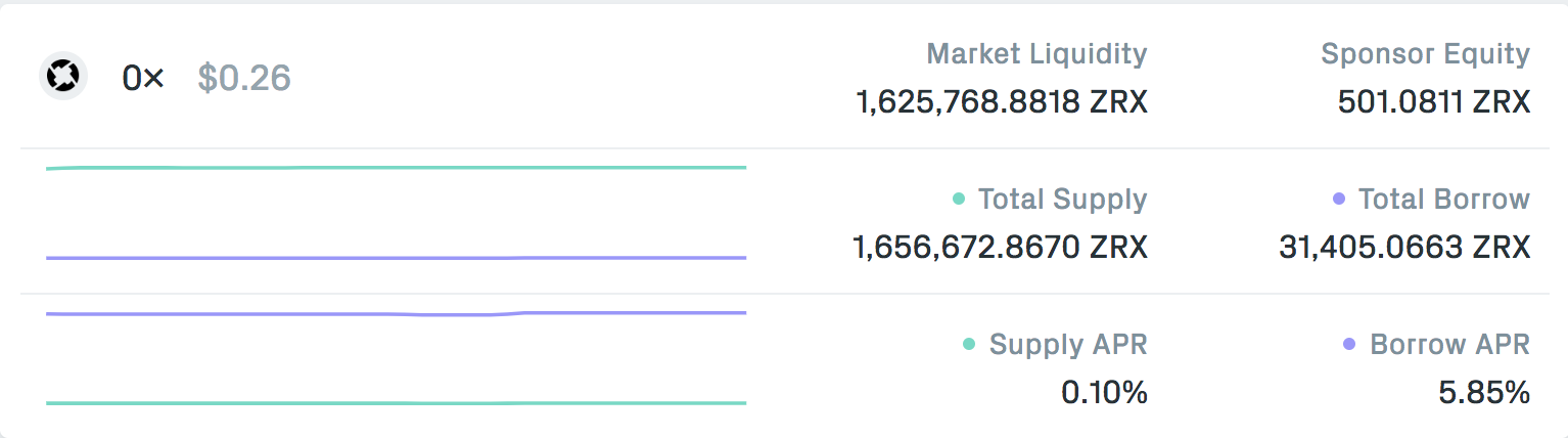 If you plan to own ZRX over an extended period of time, you might wish to generate intermediate returns by lending it at an Annual Percentage Return (APR) of 0.10% — i.e. lending $100 worth of ZRX over a year will net you a return of $0.10. If you see a short opportunity, you can borrow at 5.85% APR.