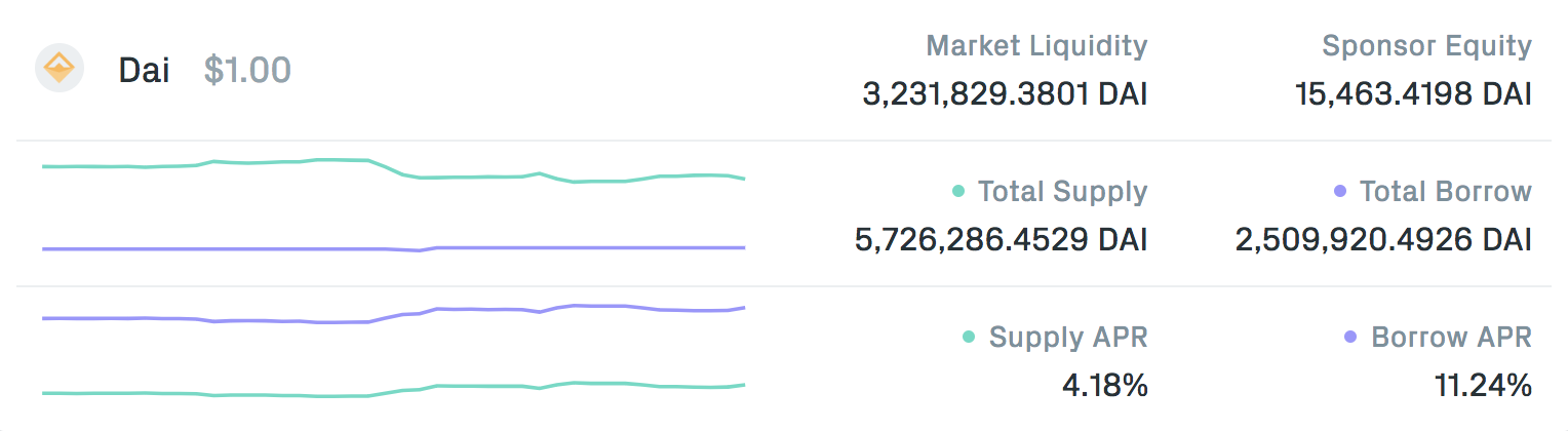 Things get particularly interesting when you look at Compound’s DAI market, where Supply APR currently stands at 4.18%, having declined from 15.33% in December.