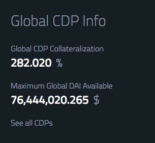 The liquidation penalty for a CDP is the amount that will be subtracted when a CDP is liquidated — the current liquidation penalty is set at 13%. When compare to Compound’s liquidation ratio of 5%, for example, this liquidation penalty seems to be pretty high — the reasoning behind this is to incentivize CDP owners to maintain margin and keep the system stable, with any 3rd party able to liquidate a CDP a profit.